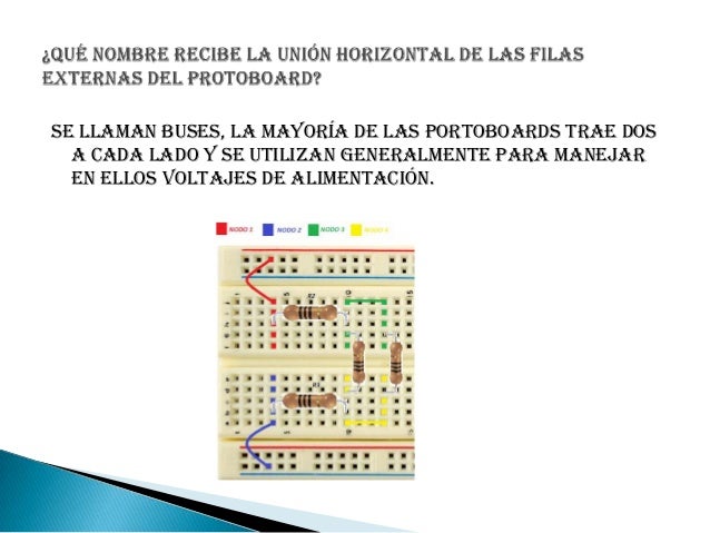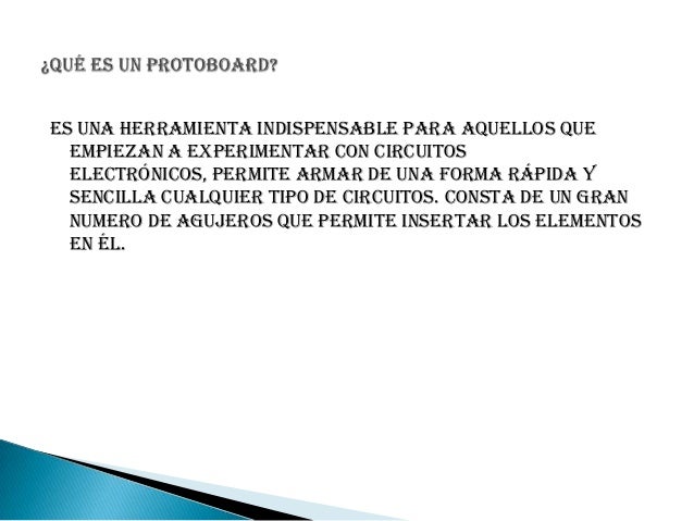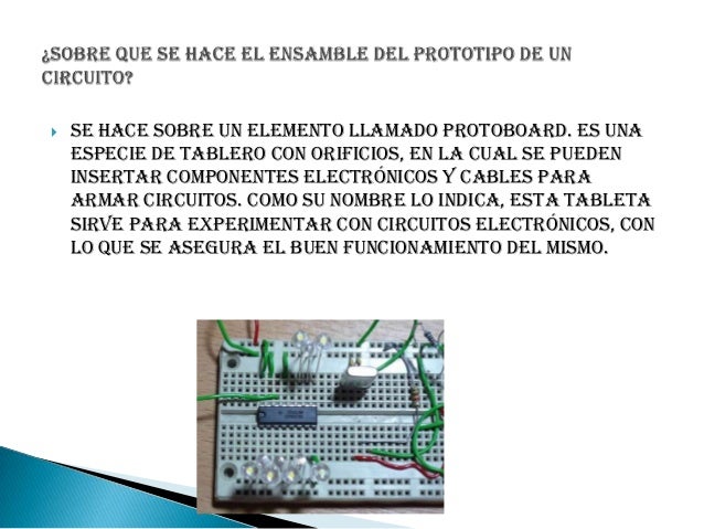- 6. se hace sobre un elemento llamado protoboard. Es una especie de tablero con orificios, en la cual se pueden insertar componentes electrónicos y cables para armar circuitos. Como su nombre lo indica, esta tableta sirve para experimentar con circuitos electrónicos, con lo que se asegura el buen funcionamiento del mismo.