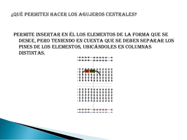 - 10. Permite insertar en él los elementos de la forma que se desee, pero teniendo en cuenta que se deben separar los pines de los elementos, ubicándoles en columnas distintas.