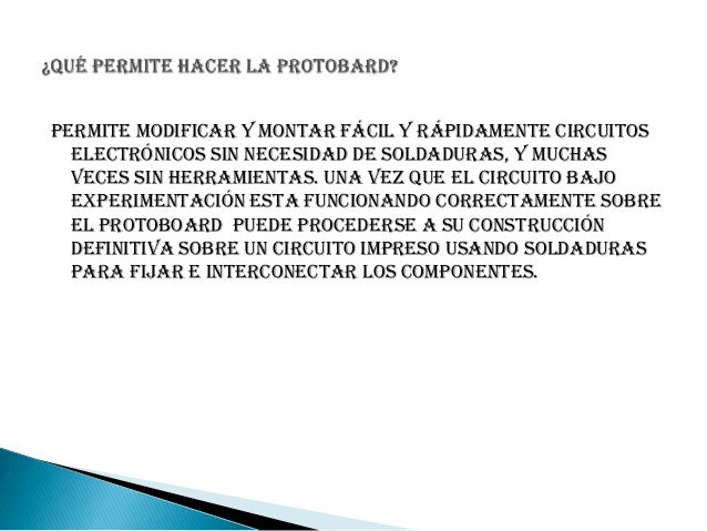 - 3. Permite modificar y montar fácil y rápidamente circuitos electrónicos sin necesidad de soldaduras, y muchas veces sin herramientas. Una vez que el circuito bajo experimentación esta funcionando correctamente sobre el protoboard puede procederse a su construcción definitiva sobre un circuito impreso usando soldaduras para fijar e interconectar los componentes.