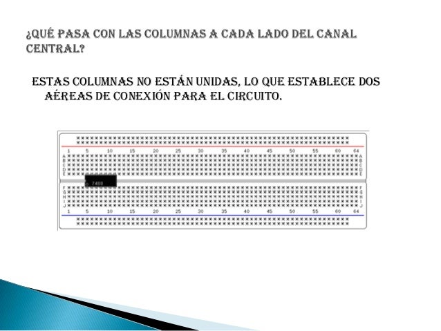 - 13. Esta constituida por un arreglo matricial de contactos. Éstos están separado entre si por una distancia de 0,1 pulgadas, distancia que corresponde a la separación entre pines o terminales de los circuitos integrados, principales componentes de los circuitos electrónicos actuales