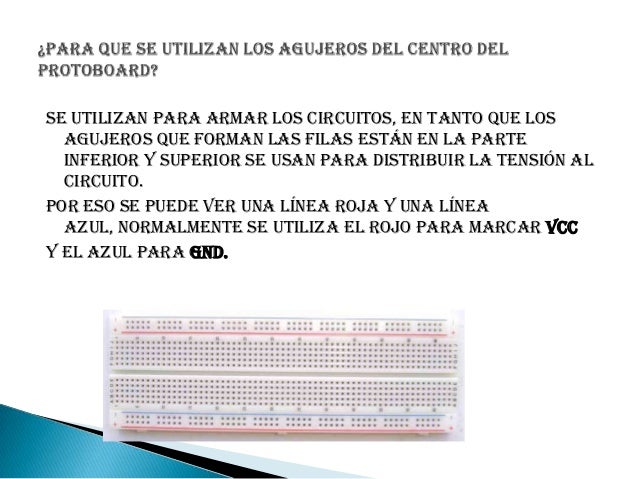 - 8. Se utilizan para armar los circuitos, en tanto que los agujeros que forman las filas están en la parte inferior y superior se usan para distribuir la tensión al circuito. Por eso se puede ver una línea roja y una línea azul, normalmente se utiliza el rojo para marcar VCC y el azul para GND.